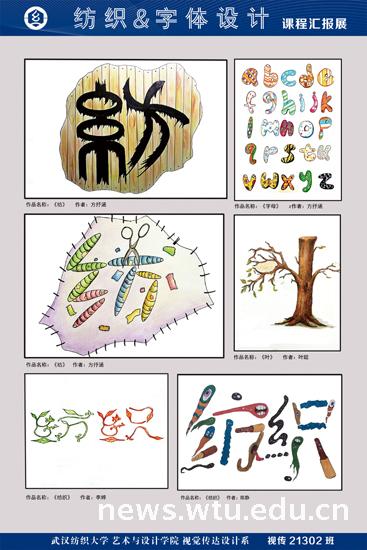 《字体设计》是视觉传达设计专业的基础课程,共36个课时。该课程开设以来,除了在设计教学过程中注意培养员工的专业理论知识和设计能力外,每年还会根据不同的设计“主题”来加强员工的研究方法与思维创新能力。视觉传达设计系主任曹刚介绍:“今年,该课程以‘纺织’为主题,在展览的作品中,既有平面字体设计也有利用纺织材料进行后期加工的设计作品,在艺术风格和艺术表现手法上呈现出不同材料‘亲密接触’的奇特效果和不同作品的艺术创新。”