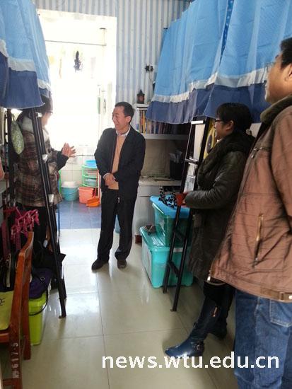 尚书记先来到南湖校区9栋615大二女生寝室,“冬天来了,冷不冷啊,多盖点被子啊”,尚书记和女生们亲切地交谈起来。看到女孩子们精心布置的墙纸、干净整洁的环境,他非常高兴,希望同学们能够继续保持,并且带动周围寝室,一起共创美好“家园”。
