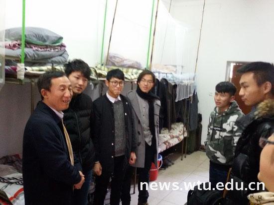 尚书记接着来到6栋110男生寝室,与设计学11406、11405班同学交谈,寝室成员叶胜强和许路同学是蓝灯志愿者,他们热情地向尚书记介绍了自己参加“蓝灯行动”半年来的感受和经历,尚书记表示非常赞赏,希望这么好的志愿者活动能够继续坚持下去。他同时对寝室文化建设提出了三点希望:希望同学们注意用水用电安全,保持卫生整洁;希望结合专业建设寝室、创建优良学风;希望同学之间互帮互助、文明和谐。