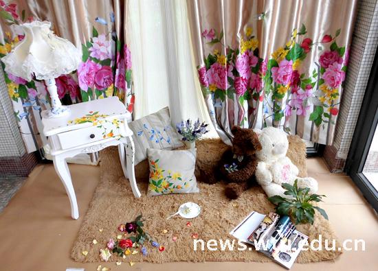 本次展览以纤维艺术、纺织作品、室内软装等形式陈列。在生活化的场景中让大家走进染织纤维艺术世界,用心去倾听感悟独特的的设计作品,体味生活之美。杨星同学的作品《沐浴森林》使用纤维通过编、结、缠、绕、等综合技法构成的软体编织设计,作品中采用了大幅度的蓝绿色,旨在提倡和呼吁人们提高环保意识,从身边做起。彰显毕业生们注重设计灵魂思想传达,完美体现生活与艺术结合。