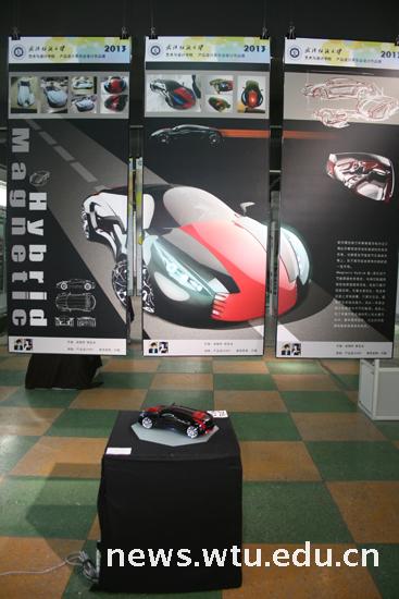 本次展览以校园文化延伸产品、科学玩具产品、交通工具及家电产品为主要创作对象,试图探讨技术与艺术、科学与审美的多种融合方式。李鹿、李泽秀同学的茶具系列设计采用能展现公司特色的符号作为造型语言,通过实际动手制作出精美的茶具用品。战伽恺同学的新能源概念汽车设计采用鲤鱼跃龙门的仿生形态,试图阐释未来汽车从传统的汽油动气向新能源的跨越。