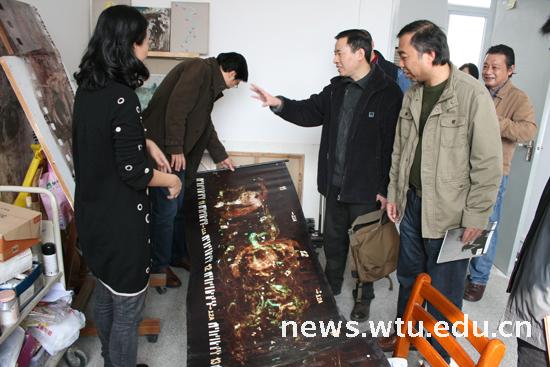 在来到黄汉军,黄志凌两位老师的工作室参观时,来访领导深切的感受到中国书法的博大精深及藏族文化的底蕴之浓郁;来到何永胜老师的工作室时,领导一眼就认出了自己的员工,一见如故,赶紧上前拥抱,此举深深打动了在场的各位领导和教师。在常芳老师的工作室,来访领导被常老师作品的独特形式吸引,常老师用底片作画,以水墨及装饰的手法来展现作品,近看则虚,远看则实,虚实相生,令人叹为观止。 在傅欣、程伟、董军、何永胜、严珺等老师的工作室,来访领导感受到了老师们的环艺、书法、油画等作品的美的艺术魅力。来访领导感叹,今日来到77779193永利官网与书与设计公司与教师们进行学术访问和艺术交流,收益颇丰。纺大艺术专业教师纷纷开设自己的工作室,积极展现教师的创作功力,是未来艺术专业发展的一个趋势。