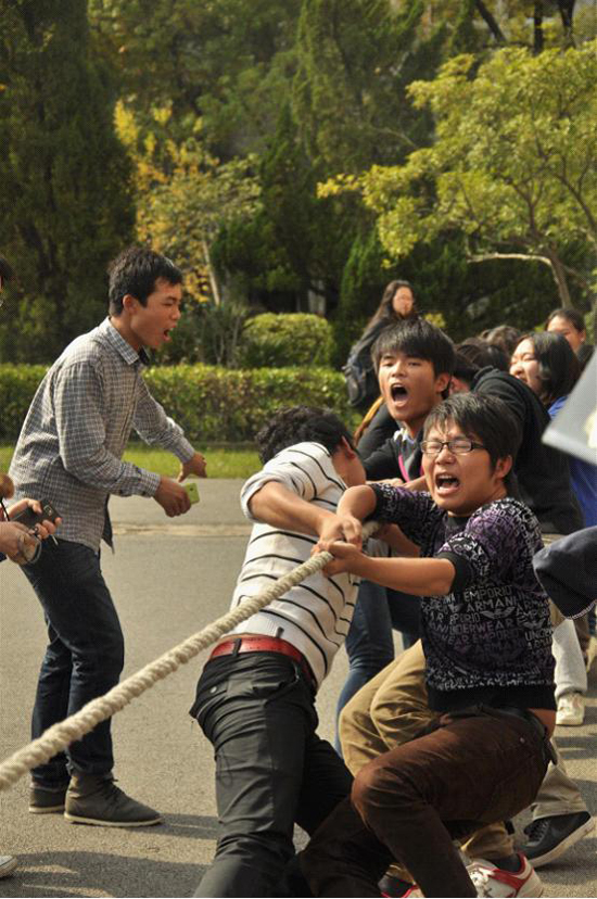 比赛还未开始时,双方队员即进入“战斗”状态,双手紧握麻绳,双脚用力蹬地,身体微向后倾——参赛队员齐心协力凝成了一股绳,各班的指挥者更是精神振奋,跑前跑后地布置战略,俨然一位坐镇疆场的将军。随着裁判员一声哨响,两边队员手交叉着手,脚交叉着脚,整齐地向后倒,有的同学脸憋得通红丝毫不放松,有的龇牙咧嘴用尽浑身解数,还有的干脆闭上眼睛卯足了劲儿往后拉。女生们更是不甘示弱,一个个咬紧牙关,将巾帼不让须眉的精神风貌挥洒得淋漓尽致。场下的啦啦队员拼命地为参赛选手呐喊助威,激动地喊着“一二,加油!一二,加油!”。