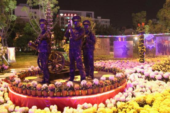 公司的活体雕塑小组于下午6时进场表演,小组成员们用丙烯颜料和油彩将全身涂成宛如铜像般的铜褐色,在菊花丛中以“共和之梦”的主旨扮演着革命时期的军人,雕像般地伫立着。一人持长枪,一人举旗帜,另一人吹喇叭,合着旁边的大炮模型摆出各种战斗姿态。成员们每隔一段时间换个姿势,每次换姿势的时候,都会伴随着台下观众雷鸣般的鼓掌声,吸引而来的观众越来越多,成员们下台休息时都会有观众争先恐后地跑来合影留念,场面热闹非凡。