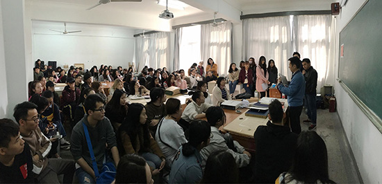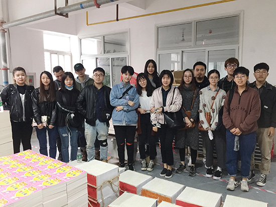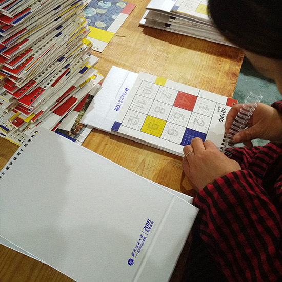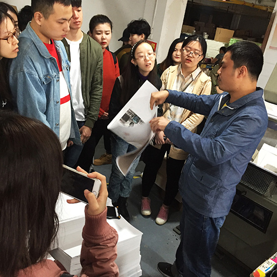 课程的展开分为版式基础知识学习、印刷厂参观见习、台历设计实践、制作见习、企业导师课程以及台历印刷六个部分。在课程学习过程中,视传专业的同学参观了印刷厂,企业导师为同学们讲解其中的制版印刷、图案印刷、整体印刷、UV印刷、装订、剪裁配页、打孔、底座面裱纸板、啤版等过程。通过几天实习,同学们体验到了印刷制作的一系列流程。装订工艺的企业导师亲临公司为同学讲解印刷过程中遇到的困难与印刷需要注意的一些重要事项,并提醒同学们台历制作中需要避免的一些不符合实际的印刷流程的设计。