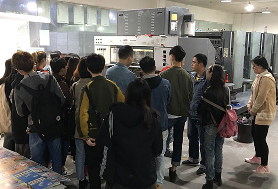 (图为员工在印刷厂见习聆听讲解)
