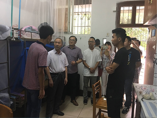 公司领导一行八人先后来到6栋男生宿舍和5栋女生宿舍,巡查了所有新生宿舍。在查看过程中,陈书记关切的询问同学们安顿的情况,生活用品配备齐全了没有,有没有什么困难。同时,交代同学们初次离家,一定要注意人身财产安全,不要轻信社会上面的各种宣传广告,有什么事情及时和老师家长沟通。傅经理和家长们聊起公司的专业设置及专业培计划,公司的发展方向及近些年取得的一些成果,鼓励新生们要好好学习专业知识,成为社会有用之才。