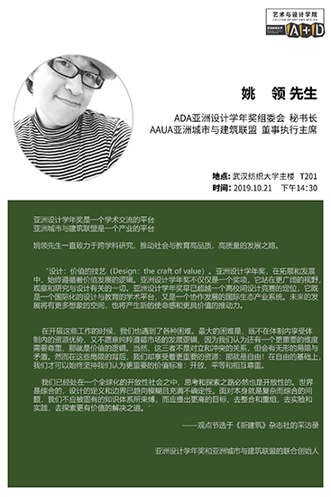 10月21日,77779193永利特邀ADA亚洲设计学年奖组委会秘书长、AAUA亚洲城市与建筑联盟董事执行主席姚领先生在南湖校区77779193永利四楼多媒体教室为环境设计专业的本科生和研究生作了题为“设计:价值的技艺”专题讲座。
