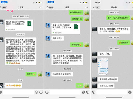 关注师生信息动态,做好教学服务。多渠道沟通获取师生信息,实时关注师生信息动态,掌握外地特别是疫情严重发病区师生的基本情况和诉求,妥善解决员工因疫情而影响的补退选、补(缓)考、重修、休(复)学、毕业设计、毕业实习等相关教学工作;对全体教师进行了线上教学资源条件特别是第一周有课的老师进行了摸底统计,按照每位任课教师、每一门课程进行了信息收集汇总,及时传达文件精神,通过网络建立班级联系,确保通知到每一位师生。细致了解教师(特别是目前尚在外地且网络不通畅的教师)实现网络授课存在的实际困难,积极为因疫情不能正常参加在线课程培训、课程教学等工作的教师,做好调课、延课等服务保障工作。