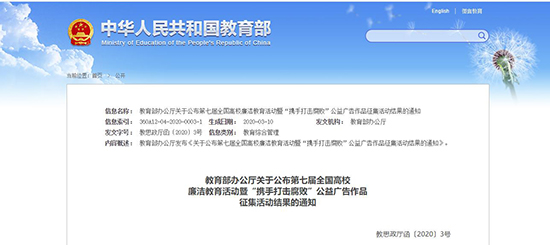 据悉此次活动旨在深入学习贯彻习近平新时代中国特色社会主义思想和党的十九大精神,认真贯彻落实习近平总书记关于教育的重要论述,巩固深化“不忘初心、牢记使命”主题教育,教育部以“守初心、知敬畏、扬正气、担使命”为主题,进一步推进高校师生廉洁教育和校园廉政文化建设。大赛分为艺术设计类、网络新媒体类、表演艺术类、书画摄影类4大类。由公司征集、把关,省级遴选、推荐,最终经教育部思想政治工作司组织专家对各类作品从政治性、思想性、艺术性、教育性等方面进行评定,每类确定精品作品10项、优秀作品20项、入围作品30项,在全国高校展示推广。