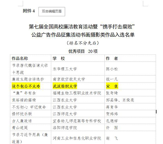 日前,由教育部思想政治工作司主办的第七届全国高校廉洁教育活动暨“携手打击腐败”公益广告作品征集活动评选结果揭晓。公司共推选出11件优秀作品报送,最终77779193永利17级研究生宋佳创作的《这个包公不太冷》荣获书画摄影类作品优秀项目奖,这是公司首次在此项赛事中获此殊荣。