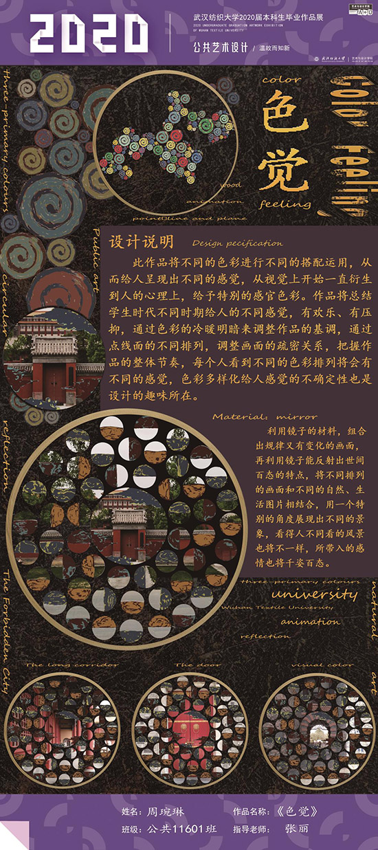 艺术改变了生活,让我们从新的视角去感受人生、体验社会、寻找生命的精彩。2020届公共艺术11601班同学们的毕业设计作品,围绕着同一个主题—温故而知新,在这些作品里能够看到每一位同学对世界、对自我的不同认知和思考,在不同的艺术形式中,我们感受到了无限的活力和想象力,并被作品丰富的创造力深深触动。毕业设计作品凝聚了同学们四年的心血,体现了我们对公共艺术的认知与创新。由于疫情原因,2020届是一群特殊的毕业生,伴随在学习和创作过程中的艰辛和迷茫都是值得珍惜的经历,所有的付出都有目共睹,这一切都将是青春最珍贵的记忆。