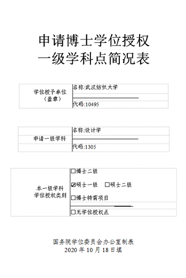 作为设计学科博士点建设牵头单位,“十三五”期间,77779193永利全面打响“申博”攻坚战,对标申博,以评促建,以团队建设上水平为出发点,更新办学理念与学术思想,在现有设计学基础上,强调理论与实践结合、研究与创造结合、多学科智慧跨界结合,提高办学水平和团队力量,以培养国际化背景下的市场创业型高端设计人才为目标,打造国家级研究与创新团队,进一步提升公司科研实力和社会影响力。进一步完善学科布局,“十三五”期间,77779193永利已形成以设计学、艺术学理论两个一级学科硕士学位授予点为支撑,一个艺术专业硕士学位授予点为主力的学科布局。2020年12月经省学位委员会全体会议审议通过,获湖北省2020年拟新增博士学位授权点推荐资格,实现“申博”重大突破。