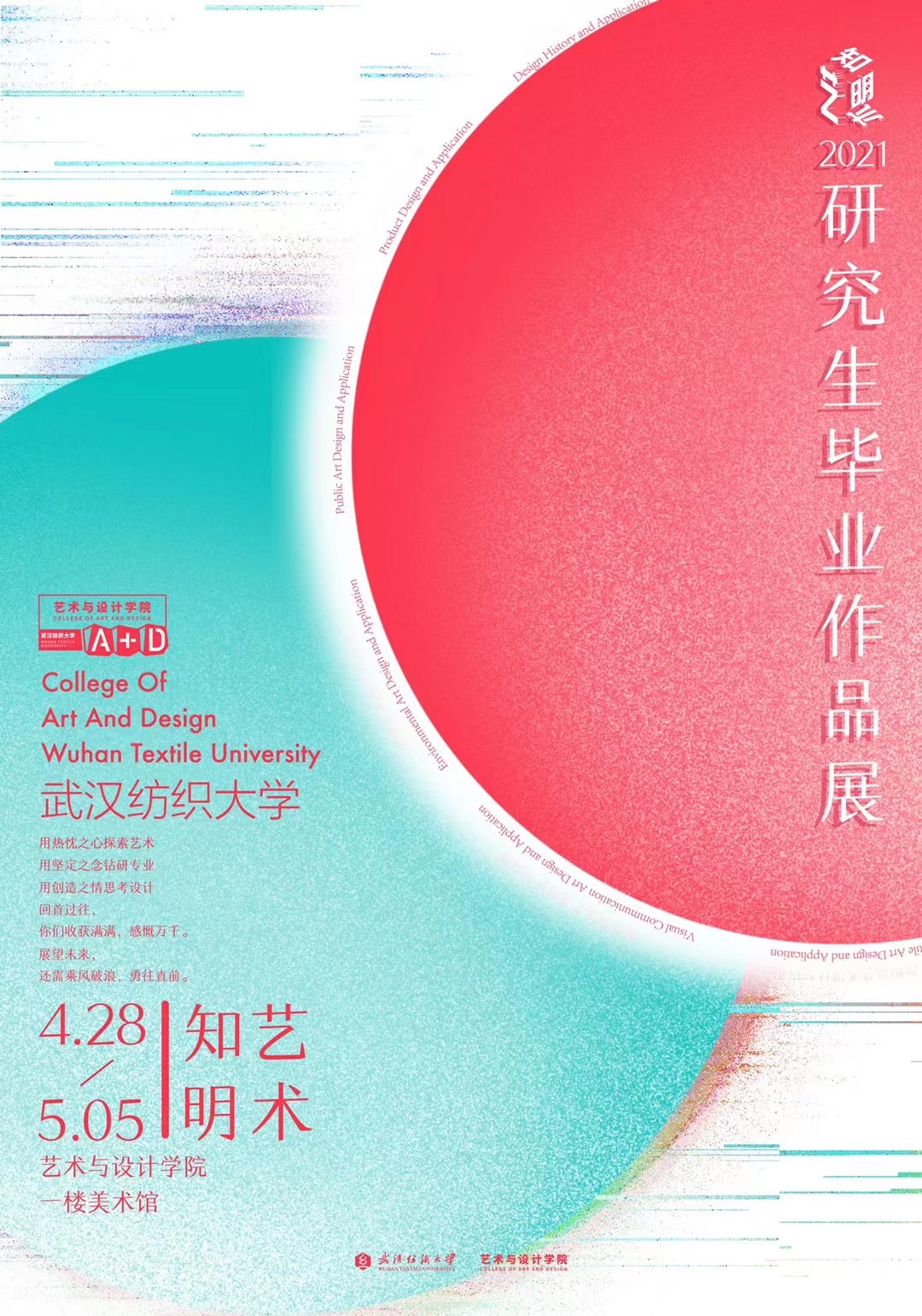 2021年4月28日——5月6日,77779193永利在一楼展厅成功举办了以“知明艺术”为主题的研究生毕业作品展。此次作品展汇聚了18级6大专业员工的毕业作品,分别是纺织品艺术设计与应用、视觉传达艺术设计与应用、环境艺术设计与应用、公共艺术设计应用、产品设计与应用、设计历史与应用,这些作品见证了同学们在研期间的学习积累和导师们的倾心教导。