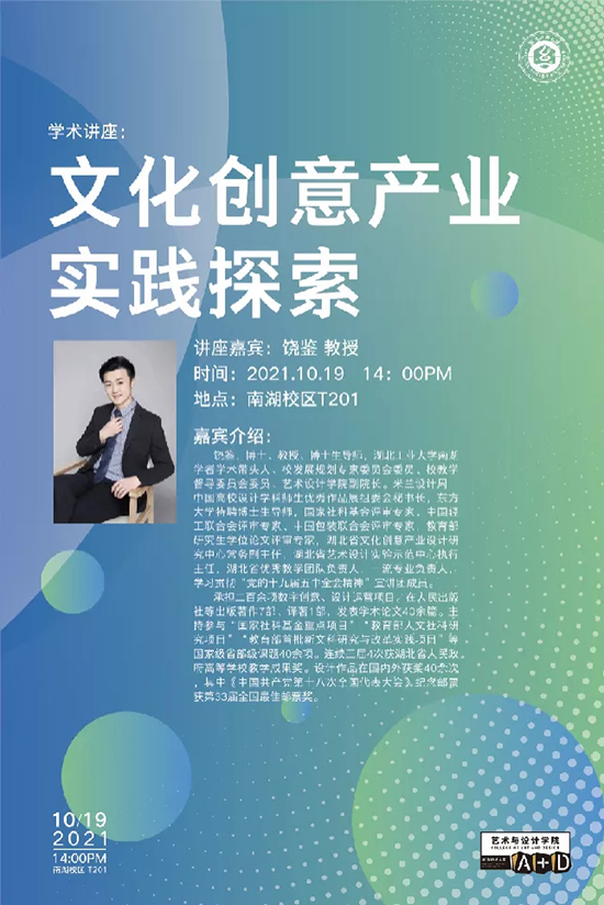 首先由来自湖北工业大学艺术设计公司副经理、米兰设计周—中国高校设计学科师生优秀作品展组委会秘书长饶鉴教授,带给大家一场“文化创意产业实践探索”的专题讲座,他结合自己多年的设计教育经历以及设计实践探索,通过展示与介绍大量的案例和设计作品,从人工智能艺术、传统工艺复兴、创新用户思维、青年建工立业四个方面为主题,就“未来以来”的大环境发展前景作出了深入阐述。他生动的讲述了人工智能如何与艺术设计创作相结合,形象的讲述了“百工百匠”如何进行传统工艺复兴,从“市场难、产品难、渠道难、联动难”四个方面,深入剖析传统工艺的市场现状,他指出“要用新媒体、新金融、新平台来打造新时代手艺人IP,复兴民艺,传播中式美员工活方式,让中国民艺文化走向世界。”饶鉴教授的此次分享,启发了同学们对未来发展环境中设计的思考,使同学们受益颇深。