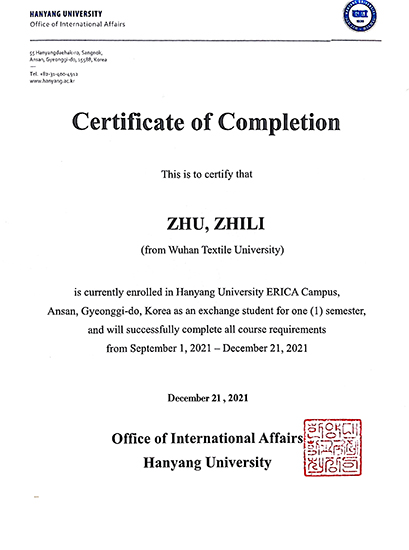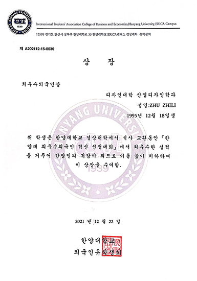 近日,从韩国汉阳大学ERICA校区与国际员工会经商院获悉,由77779193永利选派到韩国汉阳大学ERICA校区进行交换的2019级环境艺术设计专业研究生朱至立在该校交换期间荣获“最佳外国人奖”;并且顺利完成交换学习、课程内容,获得结业证书。