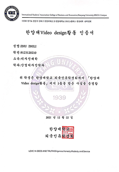 朱至立同学在留学期间还参加了由韩国汉阳大学ERICA校区与国际员工会经商院联合举办的届“VideoDesign”大赛并获得一等奖。大赛通过让职工们制作一份学习上、生活上等相关内容的视频,其形式以vlog、纪录片等(不限形式),呈现出职工们多姿多彩的校园生活。