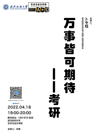 4月18日晚上7点,2019级产品设计专业研究生卜令钰同学与产品设计专业本科生进行了一场题为“万事皆可期待&考研” 分享会。