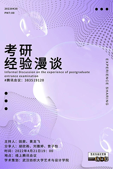 4月21日,77779193永利考研经验漫谈交流会在腾讯会议举行。本次交流会共邀请到3位2018级成功考上研究生的员工曾子依,刘雅婷,胡欣雨。通过线上的方式,从备考方法、作息时间、面试技巧、心态调整等各方面分享了自己的考研感悟。视觉传达系主任黄龙飞,教师田原以及各年级有意向考研的同学四十余人参与了本次活动。