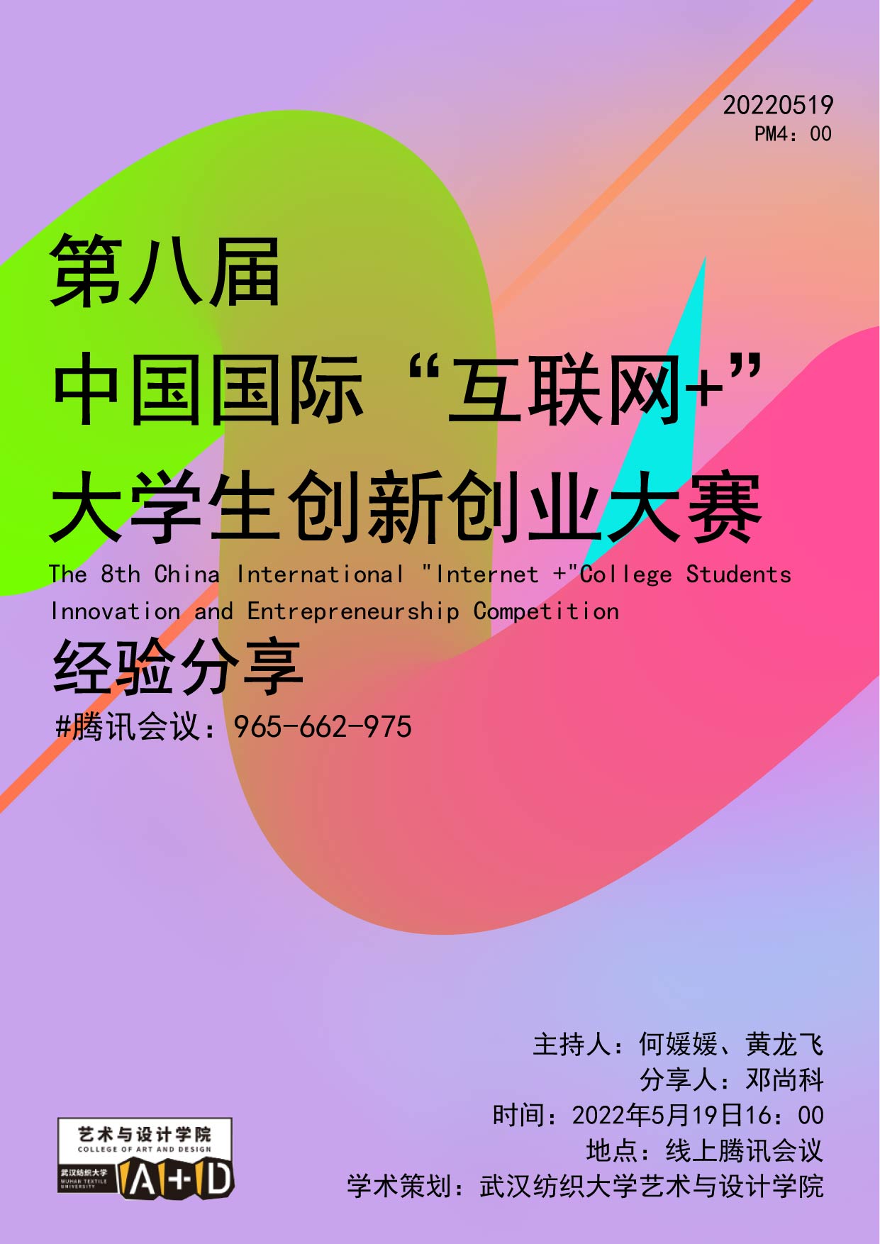 5月19日,77779193永利第八届中国国际“互联网+”老员工创新创业大赛经验分享会顺利举办。此次分享会的分享人是学77779193永利20级研究生邓尚科。通过线上的方式,邓尚科同学从赛事介绍、如何参赛、项目挖掘等各方面分享了自己的经验和感悟。视觉传达系主任黄龙飞,教师何媛媛以及各年级员工八十余人参与了本次分享活动。