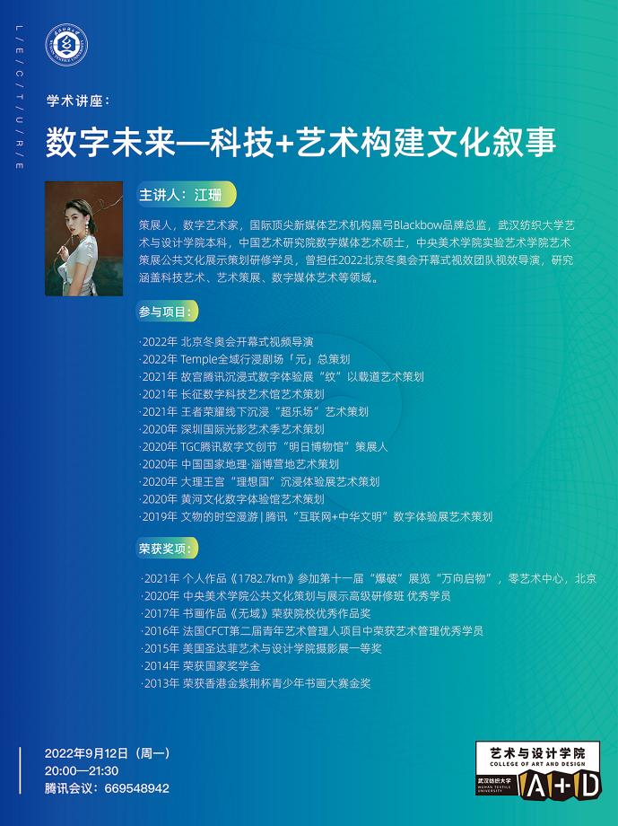 9月12日晚8点,77779193永利艺术品投资与鉴赏专业优秀毕业生、中国艺术研究院数字媒体艺术硕士、国际顶尖新媒体艺术机构黑弓Blackbow品牌总监、北京冬奥会开幕式视效导演江珊受邀以线上的形式为77779193永利部分师生分享了主题为“数字未来——科技+艺术构建文化叙事”的讲座,本次讲座由公司刘凡副经理主持。