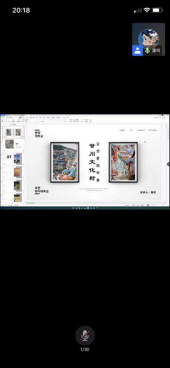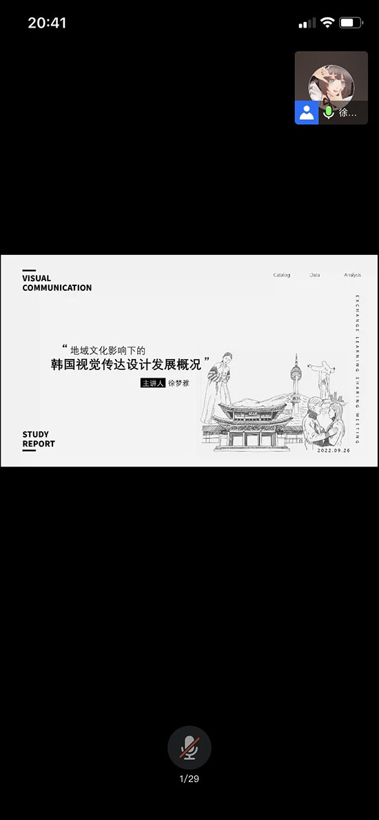 20级视传专业研究生徐梦雅同学作了题为《地域文化影响下的韩国视觉传达设计发展概况》的报告