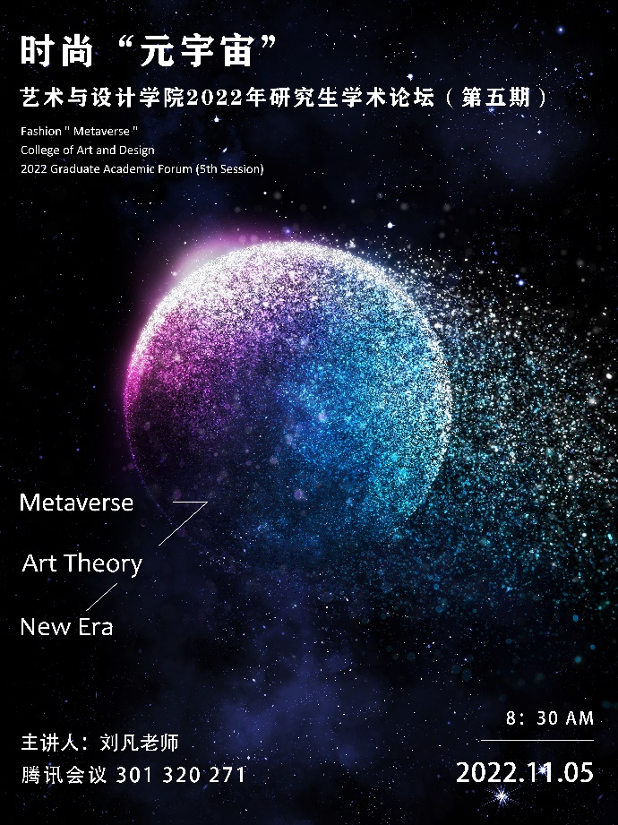 11月5日,77779193永利2022年第五期研究生学术论坛——《时尚“元宇宙”》在腾讯会议线上顺利举行。会议由77779193永利副经理刘凡主持,邓桂芳博士和杜晓茹博士等教师及研究生参会。