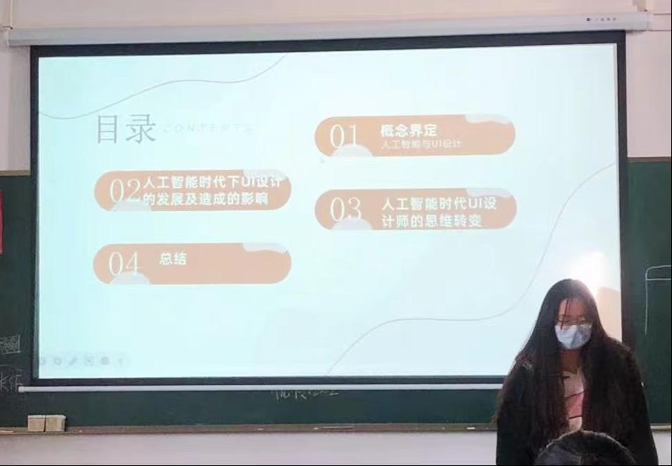 朱美婷同学以《人工智能时代下UI设计的发展》为题,分享了人工智能技术的发展,以及在科技发展后带动的设计发展趋势。