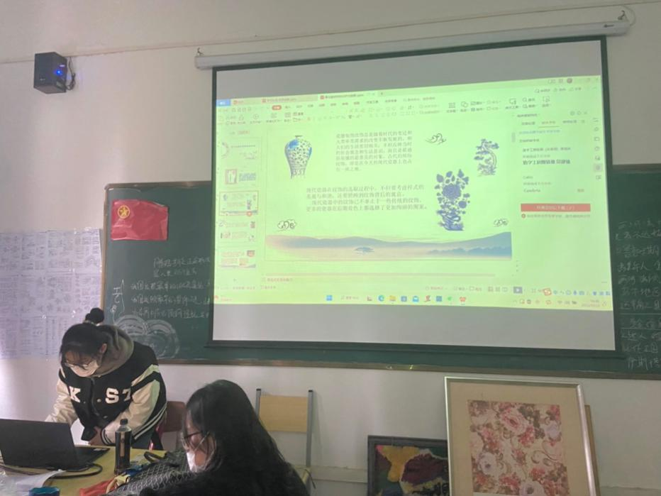 工艺美术11902班袁胜林组的同学们进行了“现代瓷器与青花纹样分析”的汇报,阐述了随着时代和现代设计的发展,瓷器在纹饰上的创新,并选取了“青花纹样”这一代表性瓷器纹饰进行具体分析,并展示了对其活化创新的过程。