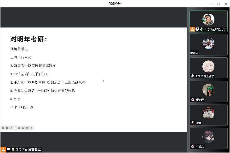 傅欣董事长在详细了解大家的备考状态后,叮嘱同学们在冲刺阶段要劳逸结合,做好知识的梳理,提高复习效率,把状态调整到最佳。考研是一场马拉松,坚持到最后才是胜利。鼓励大二大三同学提早做考研升学打算,多关注院校信息。互动环节中,副经理曹凯耐心逐一回答同学们的提问。并对近几年视传、环境设计类等专业考情做了解读,结合报考公司和录取情况做了分析,最后他鼓励积极奔赴考场的同学沉着冷静,稳住心态,相信自己,预祝大家考试顺利。勉励大三年级同学提早规划,明确考研方向与目标,可以多向研究生学长学姐请教。