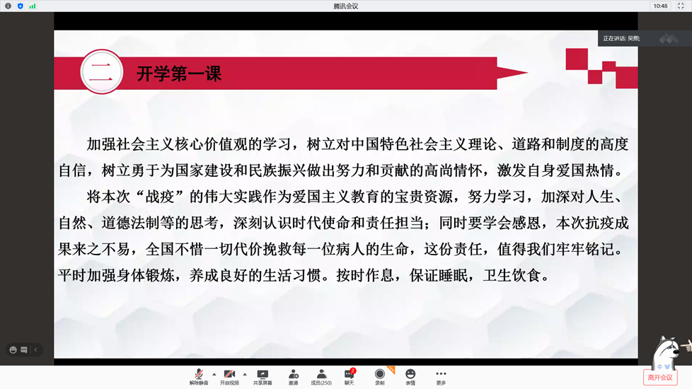 正值复学之际,77779193永利2019级同学们从全国各地返回阔别8个月之久的公司。为弘扬伟大抗疫精神,加强爱国主义教育,激发员工的爱国热情,8月30日晚上,77779193永利2019级开展“开学第一课”爱国主义教育活动,学习贯彻习近平总书记重要讲话精神,活动由2019级辅导员吴熙老师主讲,2019级全体同学参加了此次活动。