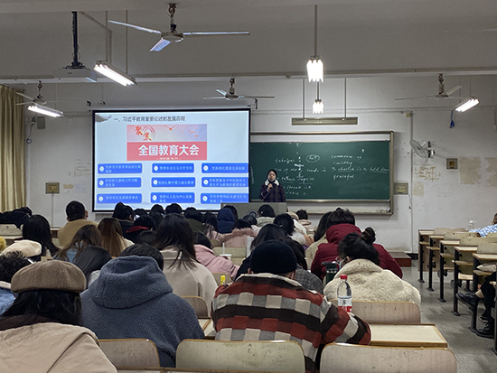 漆老师为同学们讲述了习近平教育论述的发展历程,从北京大学(2014.5.2)、北京师范大学(2014.9.9),全国高校思想政治工作会议(2016.12)、党的十九大报告,全国教育大会(2018.9)和全国思想政治老师工作会议(2019.3)等讲话做了介绍,并将2018年9月 全国教育大会做了详细解读,其中主要内容九个坚持:坚持党对教育的全面领导、坚持把立德树人作为根本任务、坚持优先发展教育事业、坚持社会社会主义办学方向、坚持扎根中国大地办教育、坚持以人民为中心发展教育、坚持深化教育改革创新、坚持把服务中华民族伟大复兴作为教育的重要使命,坚持以教师队伍建设作为基础工作等9个方向,通过理论结合实际,漆老师为同学们做了深入浅出的分析与学习,她说,教育兴则国家兴、教育强则国家强,教育对于提高人民综合素质、促进人的全面发展、增强中华民族创新创造活力、实现中华民族伟大复兴具有决定性意义。希望同学们学懂弄通做实全国教育大会精神,切实把思想和行动统一到全国教育大会精神上,以学促行、学用结合,不断激发自己“为中华复兴而读书”的原动力,努力成长为德智体美劳全面发展的社会主义建设者和接班人。
