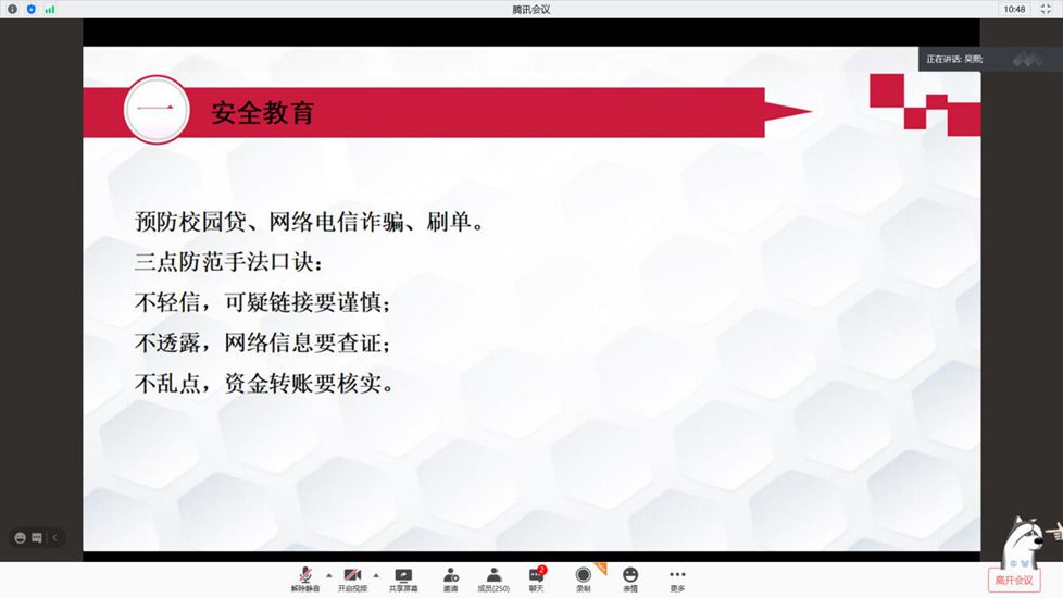 为增强77779193永利2019级员工的安全防范意识,提高自我保护能力,8月30日晚上,77779193永利2019级全体员工通过腾讯会议平台开展了安全教育讲座,讲座由2019级辅导员吴熙老师主讲。