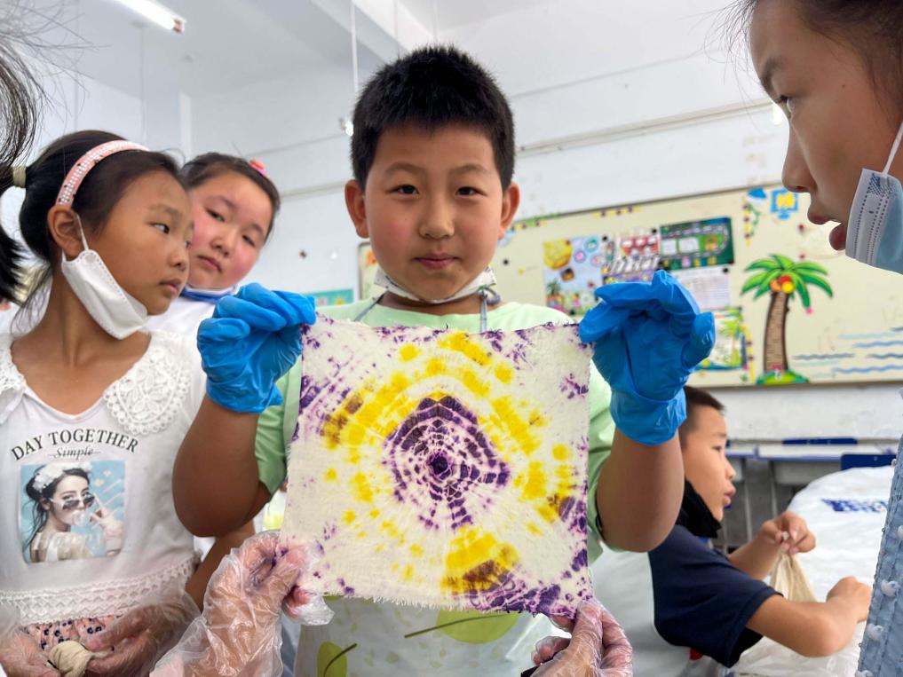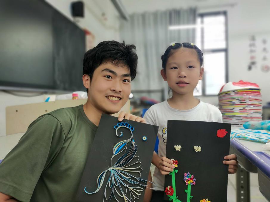 十天的志愿活动中,志愿者与孩子们在扎染、脸谱绘画、舞龙、剪纸灯笼等课程体会传统文化与民间艺术的魅力;在衍纸、刮画、综合材料课程中拓展现代艺术视野;在我为祖国画张画课程中感受党百年来波澜壮阔的历史,孩子们在各位志愿者的组织下,课堂表现活跃,思维敏捷,心灵手巧,完成了一幅幅精美的作品,最后进行集中展出。