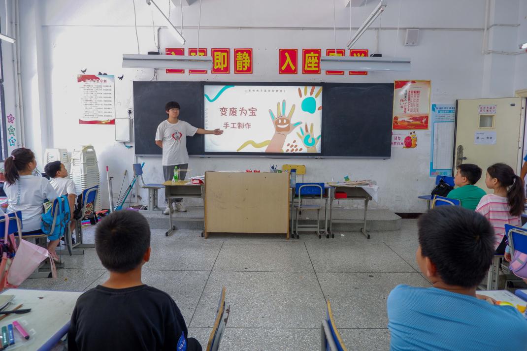 7月13日活动中,神农架林区实验小学的120个孩子们在志愿者袁曦宇的带领下,以“变废为宝”为主题,通过综合材料的形式废旧物品再利用的方式展开手工实践。