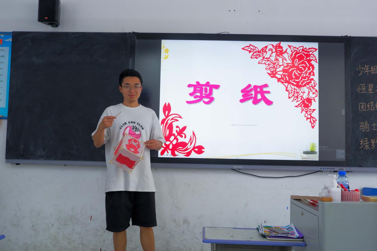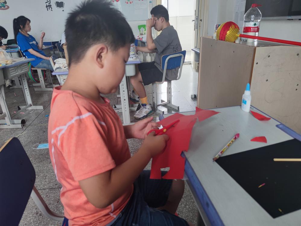 7月13日活动中,志愿者樊梓康将剪纸与灯笼制作相结合,带领神农架林区实验小学的120个孩子们学习剪纸与灯笼中的中国民俗文化。