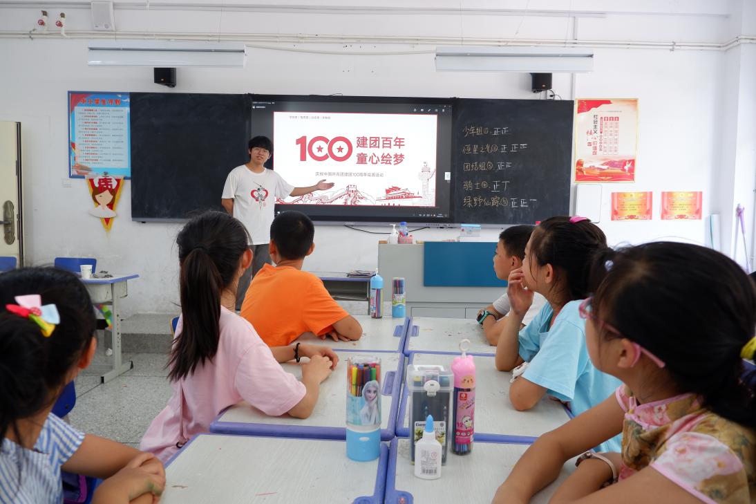 志愿者袁曦宇以时间顺序,遴选重大事件,以文字、动画、视频等形式,通俗易懂地讲解共青团作为党的助手和后备军在中国革命、建设和改革过程中发挥的积极作用,并号召孩子们从小要树立远大理想。互动环节孩子们踊跃发言分享心得体会,最后通过画笔,绘制出一幅幅爱国主义主题精美作品。