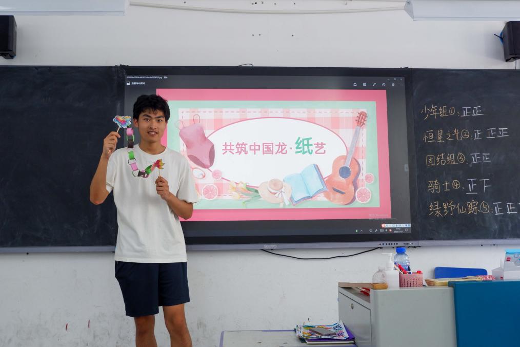 志愿者何汶宪以“共筑中国龙”为主题,向孩子们介绍中国传统龙图腾,再以纸艺为抓手,让孩子们进一步了解中国传统的舞龙文化,使孩子们对民族传统体育中舞龙运动与基本技术方法有了更深认识,通过带领孩子们进行舞龙活动感受龙图腾精神。