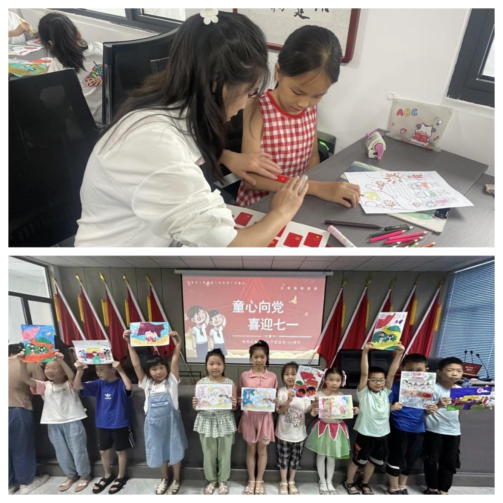 志愿者向庭瑶还教小朋友们用彩色笔尽情地在纸上绘画着党史报,飘扬的五星红旗、在国旗下微笑敬礼的祖国的花朵,无不透露着小朋友们对祖国的热爱。