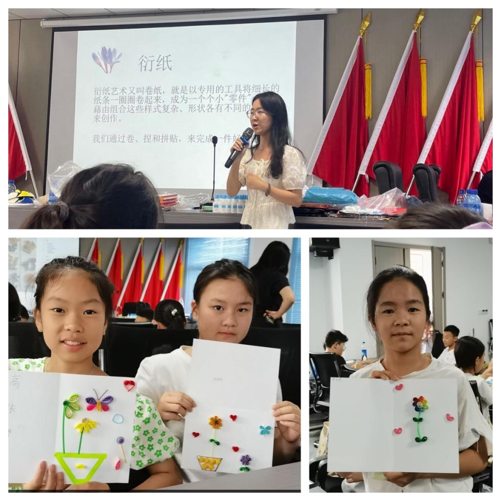 除了扎染,志愿者程程还教小朋友们将纸条运用卷、捏、拼贴组合形成具有优美曲线与丰富色彩的衍纸画。色彩鲜艳的花束,灿烂的笑脸,美丽的彩虹……小朋友们充分发挥想象力,呈现出衍纸的魅力。