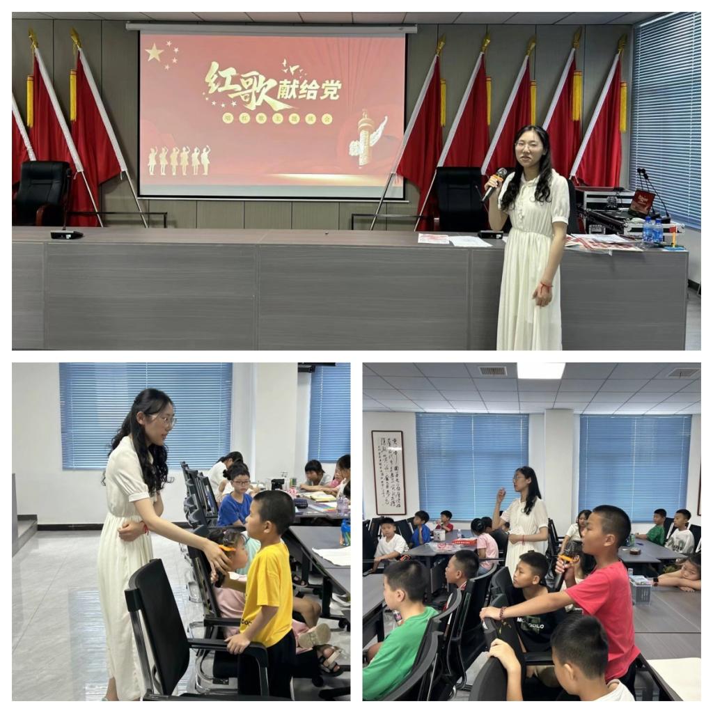 志愿者汪瑞教小朋友们唱红歌,感党恩,一同庆祝党的生日。通过合唱《没有共产党就没有新中国》、《团结就是力量》、《红星闪闪》等红歌,小朋友们表达出对祖国,对党的无限热爱。