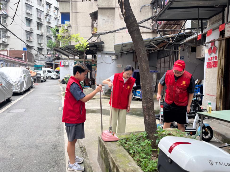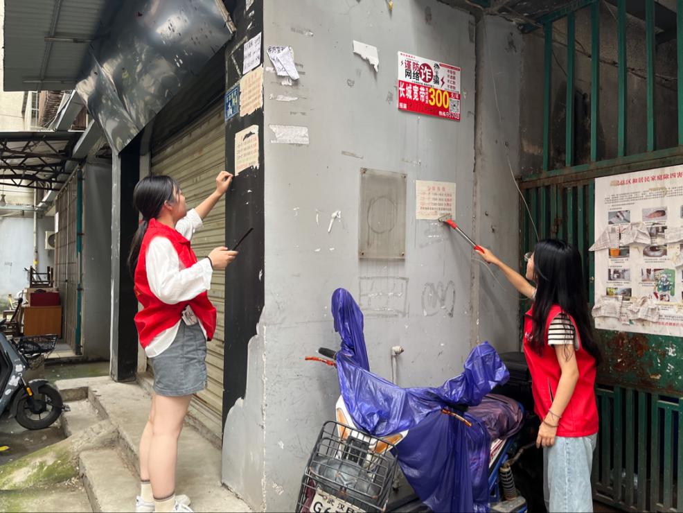 到达社区后,志愿者们迅速投入到清洁活动中,大家在自己的服务点上开始行动,有的同学将花坛中的烟头、果皮挑出来扔进垃圾桶;有的同学清洁墙上的“牛皮癣”;有的同学引导来往居民将垃圾扔进垃圾桶;有的同学则是向居民普及关于垃圾分类的知识。